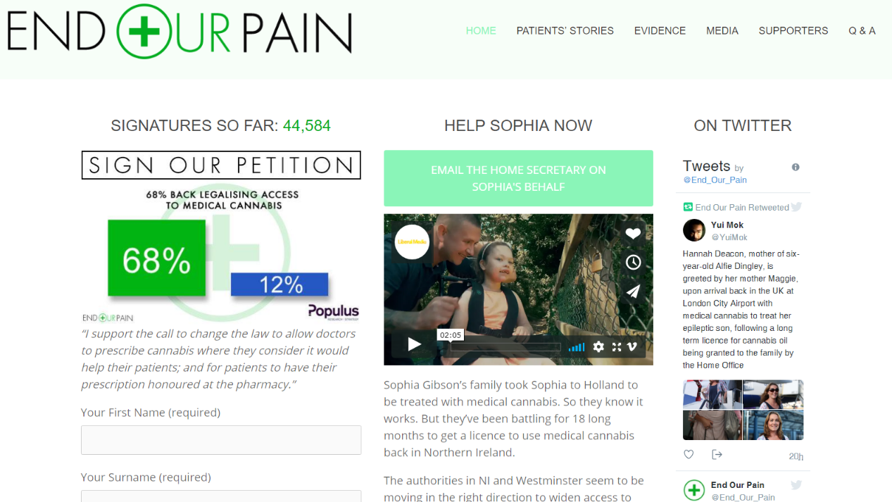 “Last year, as a supporter of the End Our Pain campaign, you helped secure the legalisation of medical cannabis under prescription. Unfortunately, we need to ask for your help again. The policy is simply not working. Patients do not have access to what is now a legal medicine in the UK and are being left to suffer needlessly. Some of them are children with intractable epilepsy.