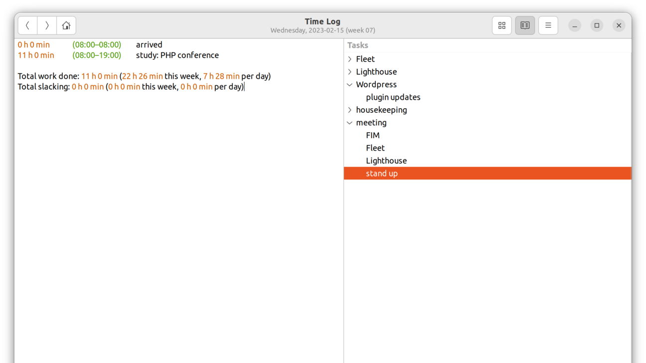 gtimelog records the current timestamp and whatever I typed into one long text file. This format is so simple that even when I’m working away from my main computer or in Windows rather than Ubuntu, it’s only slightly more complicated to write entries by hand, save them in a text file or Google Keep or wherever, and copy and paste them back into the main log file when I get back to my desk.