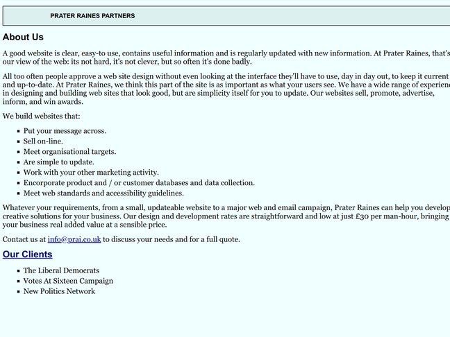 2003 was a year of remarkable growth for Prater Raines. We built bespoke website developments for the New Politics Network, the campaign for Votes at 16, the Parliamentary Candidates Association, and events website The Full Effect. But it was the runaway progress of our Liberal Democrat website platform that most proved the business would be lasting and successful.