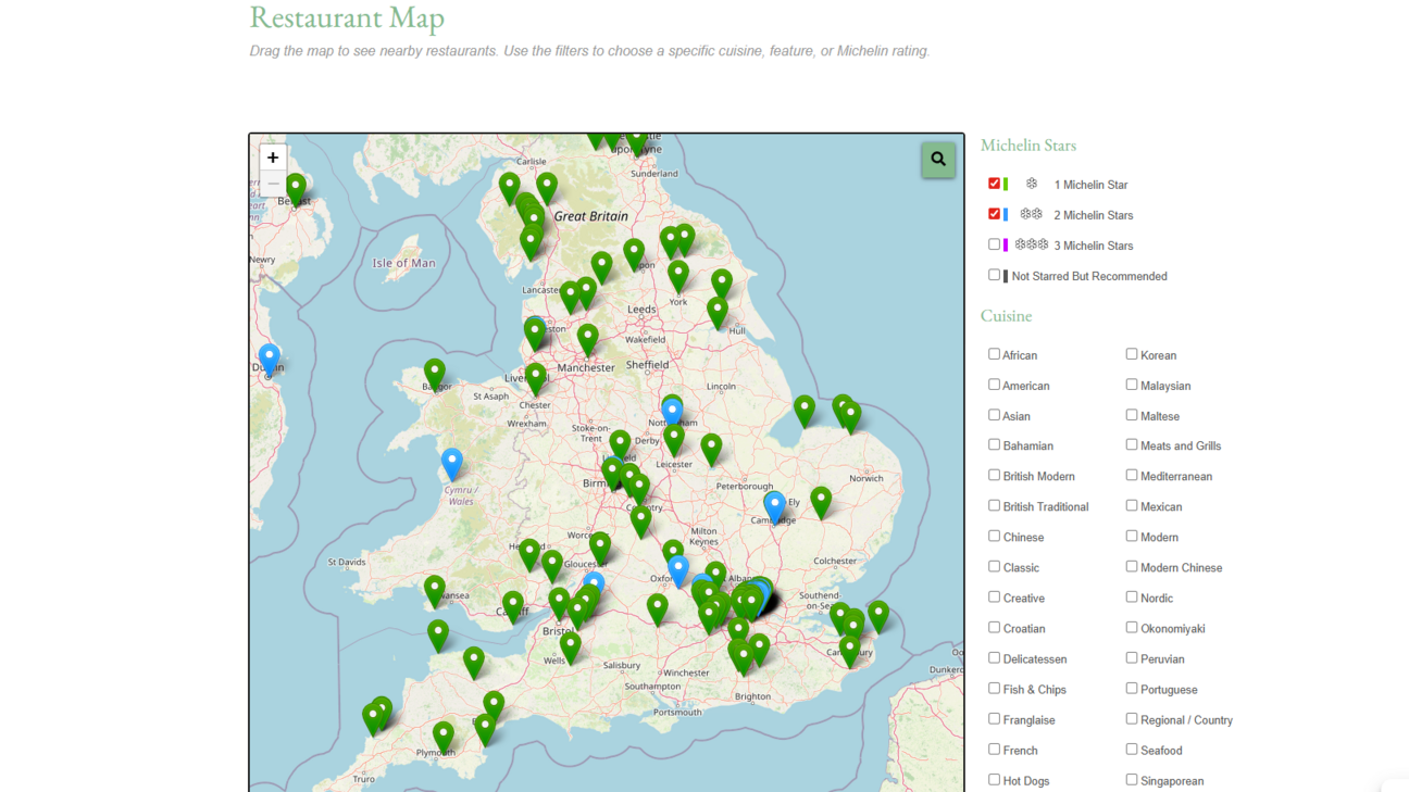 Finally, we’ve put in place a Google map on the site marking all reviewed restaurants as pins. Each pin is coloured white, bronze, silver or gold to indicate the Michelin Star status to the restaurant. Clicking on a pin opens a window with the summary and a link to the review. You can filter the map by Michelin rating, cuisine, and “best for” categories, and if you agree to share your location with the site, the map centres on your location: neat, we think!