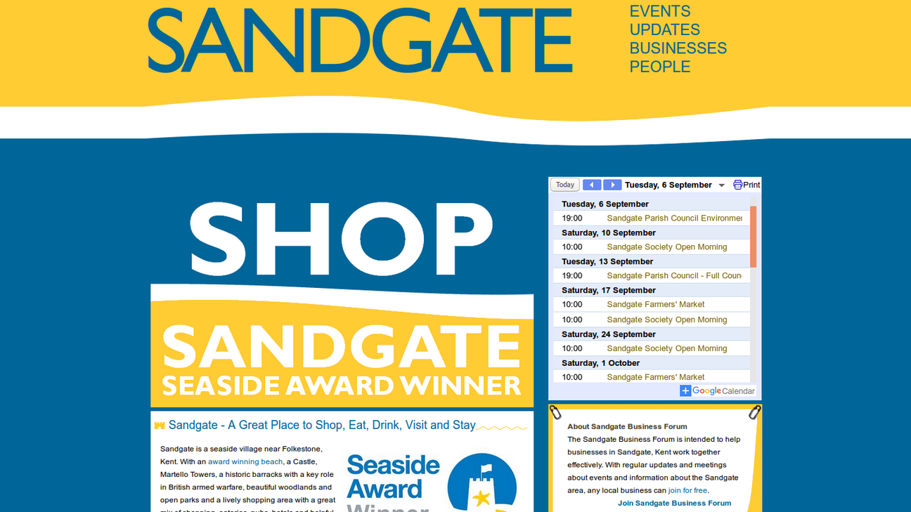 The Sandgate Business Forum website offers free listings to all local businesses and also co-ordinates a free business email list to update businesses on forthcoming local events and news. Prater Raines put together the site, including the design and branding, which has then been reflected elsewhere in the Sandgate Community - from street flags to the Sandgate Parish Council website.