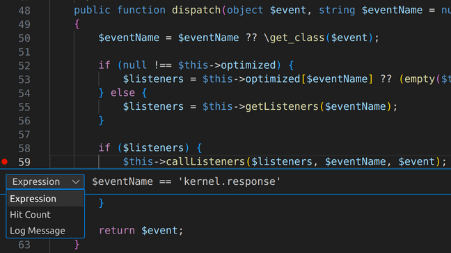 | F10 | Step over to the next statement in the current function. In this case this would call all the listeners, and pause execution at line 62, return $event;. | |