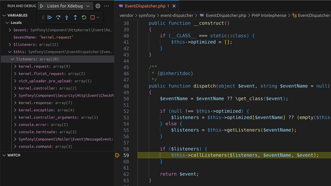 Open the “Run and Debug” tag on the left or press Ctrl–Shift–D. It’s unlikely your project has the appropriate customisation so you’ll probably see the message “To customize Run and Debug create a launch.json file.” Click the launch.json text and, if necessary, choose “PHP” from the list of language choices which will create you a default .vscode/launch.json in your current project.
