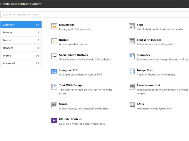 Prater Raines have created a series of custom blocks designed to use the global look and feel of the service, but ensure its simple to add blocks such as Calls to Action, support buttons, petition forms and more. Similarly although the news plugin is “off the shelf” it has then been customised to meet the organisational need, removing fields and options that are going to go unused.